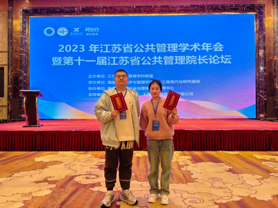 闭幕式环节,江苏公共管理学科联盟理事会秘书长周绿林教授宣读本届论坛获奖论文名单,颜金院长受邀为获奖同学颁奖。我校文法学院2021级MPA研究生王秋文投稿论文《“放管服”改革背景下L市G区营商环境的优化路径研究》荣获论坛征文二等奖,2022级MPA研究生张欣欣投稿论文《公务员数字素养的研究现状及中国情境下研究展望》荣获论坛征文二等奖,2022级MPA研究生殷诚浩投稿论文《城市环境治理之道:公共价值、现实困境与实现路径》荣获论坛征文三等奖。