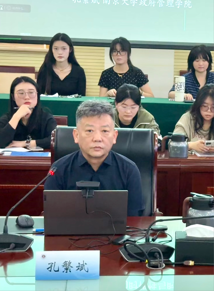 颜金表示热烈欢迎参会人员,介绍孔繁斌教授作为国家高层次人才特殊支持计划入选者、全国公共管理专业硕士研究生教育指导委员会委员等诸多重磅头衔的学术专家,深耕行政管理学与公共政策过程研究多年。