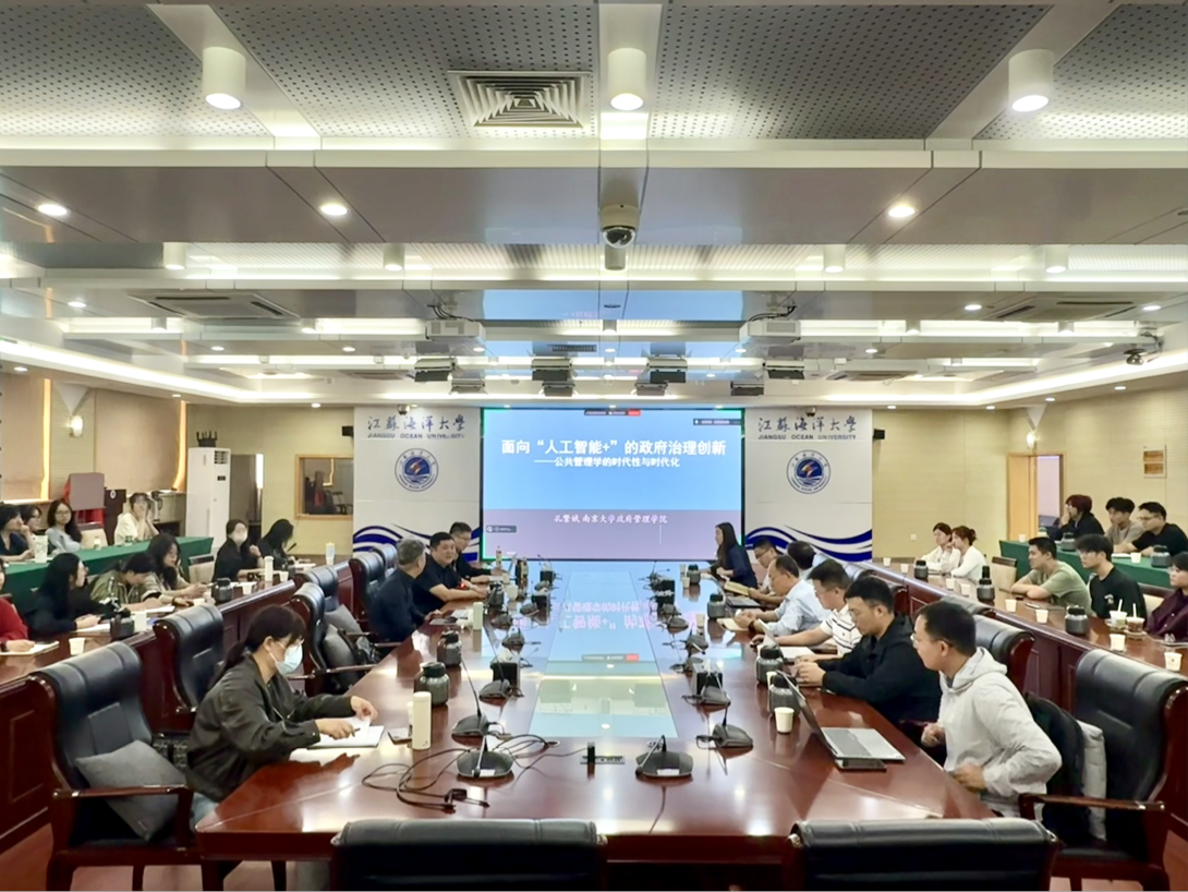 在学校“三建一高”总体目标引领与“十四五”规划深化推进的关键时期,2025年10月10日上午9点,在江苏海洋大学苍梧校区东海厅举办“面向‘人工智能 +’的政府管理创新”的专题讲座。本次讲座由文法学院副院长颜金教授主持,特邀南京大学公共政策研究院院长孔繁斌教授主讲,参会成员有公共管理系教师, MPA教育中心硕士生导师、农村发展硕士研究生、公共管理硕士研究生及部分本科生。